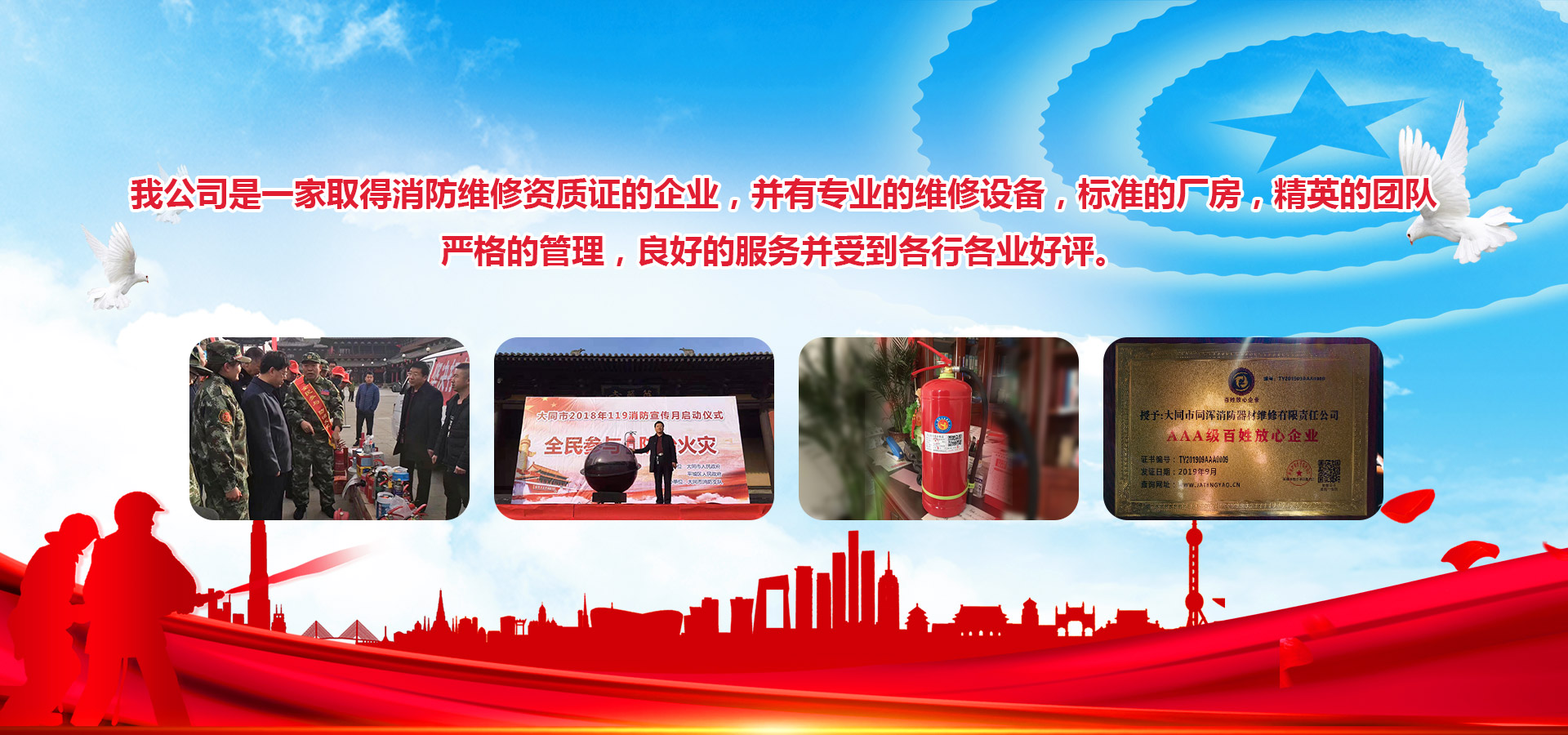 大同市同渾消防器材維修有限責任公司,位于大同市同泉路389號,始建于2000年,是公安部消防局定點銷售和維修的企業(yè),歷經(jīng)多年的創(chuàng)建、發(fā)展和拼搏,現(xiàn)有多家消防器材廠商供應(yīng)我公司,并有現(xiàn)代化維修設(shè)備,標準的廠房,嚴格的管理,優(yōu)良的設(shè)備,良好的服務(wù)并受到各行各業(yè)的好評。總經(jīng)理劉國玉嚴格管理,嚴格要求,精益求精,認真負責,帶領(lǐng)團隊熱烈歡迎各界朋友顧客光臨。